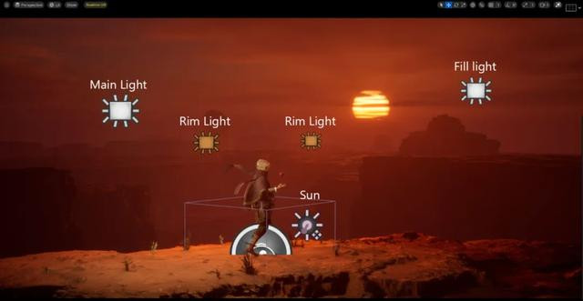 为了最终呈现效果,我从 Megascans 下载了一些石头和一个苹果。然后,我使用 Unreal 中的环境照明混合器工具设置天空,这使我能够模拟真实的太阳。之后,我在 Unreal 中添加了 4 个矩形灯,以吸引人们对角色细节的注意。这些额外的光源有助于创造深度和对比度,确保角色成为场景的焦点。